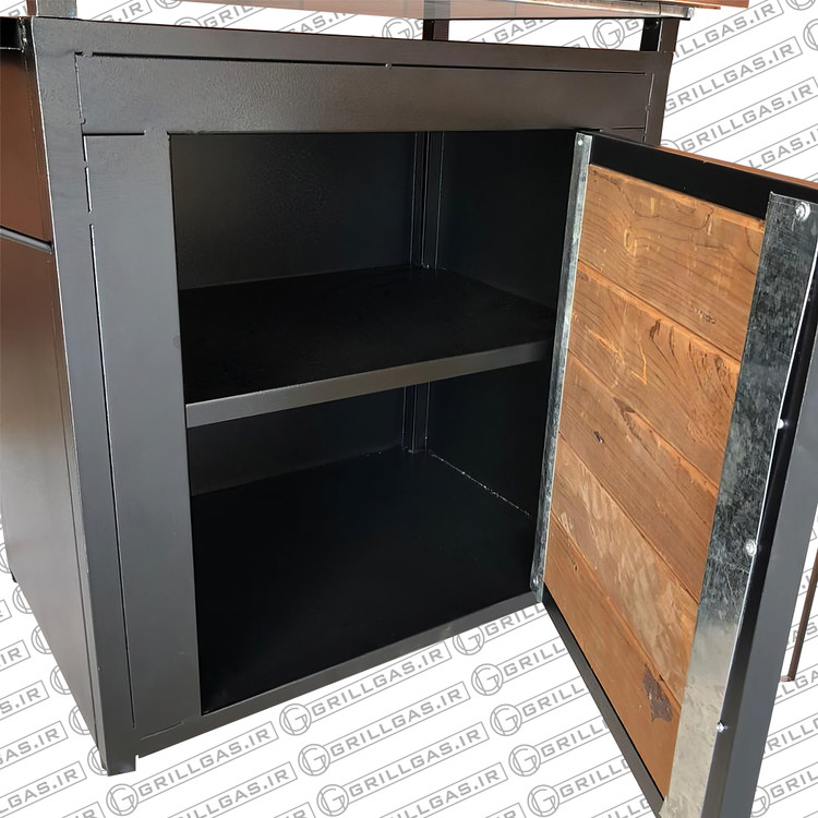 امکانات: کابینت چوبی. میز چوبی کمکی - چدن های U شکل - 2 عدد شیر استاندارد ایران - دارای یک جفت میله بالابر سیخ